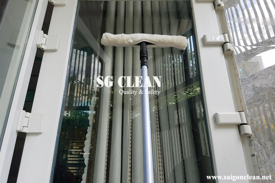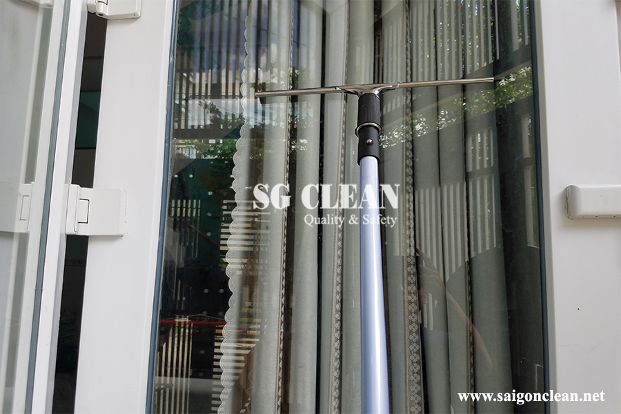Ngoài ra nếu vệ sinh kính ở trên cao còn sử dụng đầu kẹp rẻ lau kính để giúp làm sạch nước còn dính trên bề mặt kính.